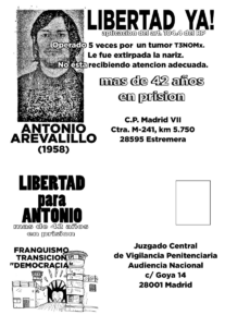 Antonio Arevalillo Sanz nació en Segovia en 1958, tiene, pues 67 años, y desde los 9 años creció en el barrio bilbaíno de Zorroza. En los años 70, como otros muchos jóvenes de origen humilde, se dedicó al atraco de bancos, joyerías y supermercados. Desde 1974, ha sido detenido docenas de veces y se ha fugado en tres o cuatro ocasiones.Participó en la lucha de la COPEL y, en 1983 fue uno de los protagonistas de una revuelta en la prisión de Basauri. En total ha permanecido preso más de 42 años, 15 de ellos en Régimen Especial de castigo (aislamiento). Hace unos años le fue detectado un tumor nasal que ha requerido cinco complejas operaciones quirúrgicas. En el año 2016 Antonio cumplió los tres cuartos de su condena, pudiendo acceder legalmente a la libertad condicional.