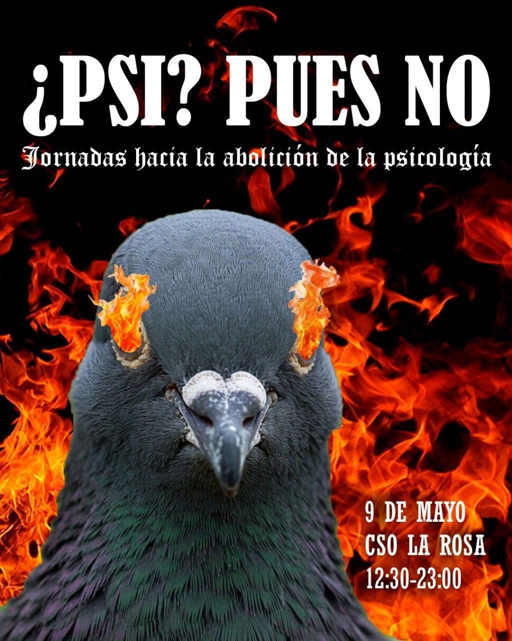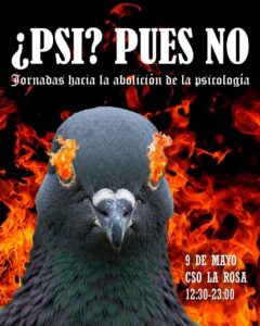 Jornadas hacia la abolición de la psicología Detalles de Evento Date: 9 de mayo de 2026 12:30 – 23:00 Categorías: Convocatorias En el CSO la Rosa (Madrid) Próximamente se publicará el programa